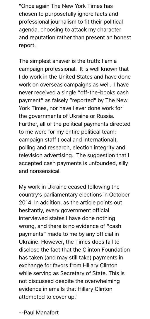 Donald Trump's campaign chief accuses the New York Times of a hatchet job against him in a Monday story that alleges he received shady payments out of Ukraine, reports Politico. “Once again, the New York Times has chosen to purposefully ignore facts and professional journalism to fit their political agenda, choosing to attack my character and reputation rather than present an honest report,” says Paul Manafort said in a statement. “The suggestion that I accepted cash payments is unfounded, silly and nonsensical.” According to the Times report, handwritten ledgers uncovered in Ukraine suggest that Manafort received $12.7 million in previously undisclosed, illegal payments for his work on behalf of a pro-Russia political party there.